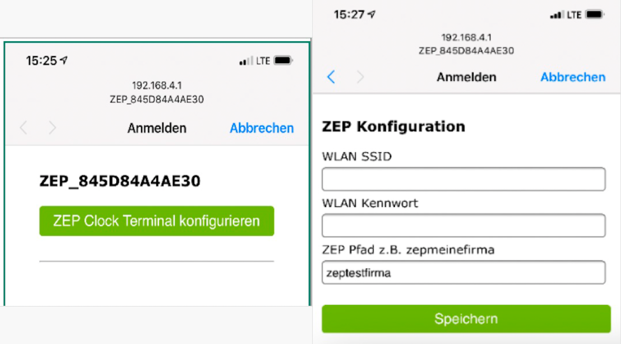 Abhängig vom Smartphone wird entweder automatisch die Startseite zur Konfiguration des ZEP Terminals angezeigt oder Sie müssen das WLAN ZEP_nnnnnnn nochmals anklicken um sich zu verbinden.