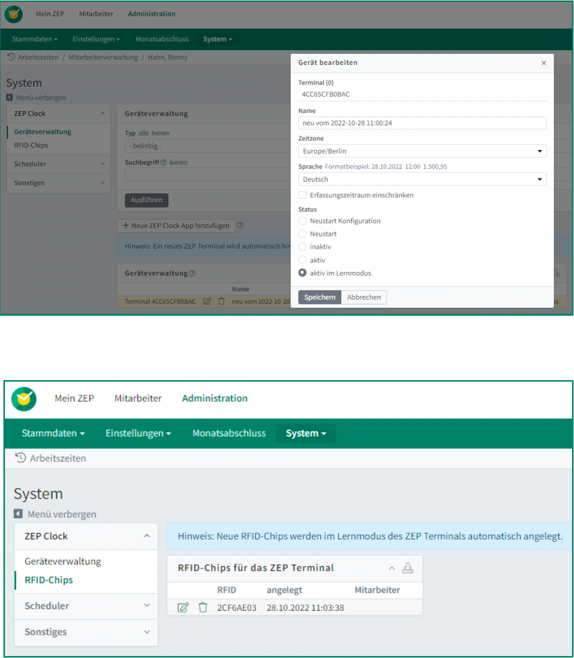 Da die RFID-Nummer in ZEP noch unbekannt ist und das Terminal aktiv im Lernmodus ist, wird sie in ZEP registriert (angelegt). Sie sehen diese dann in ZEP unter Administration > System > RFID-Chips.