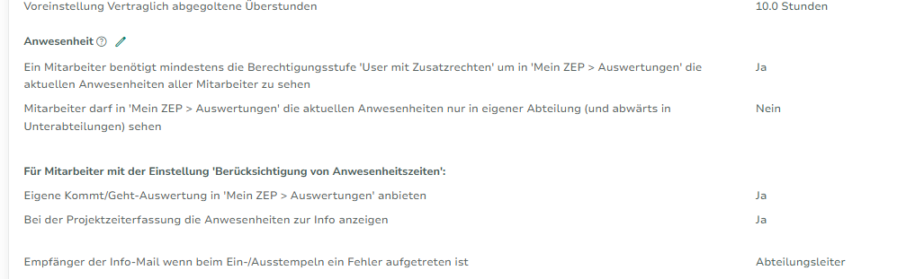 An employee needs at least the authorization level 'User with additional rights' to see the current attendance of all employees in My ZEP > Evaluations